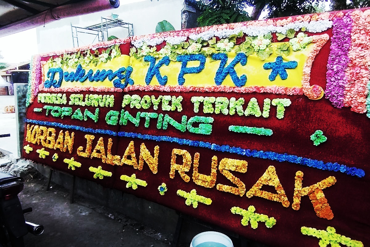 Papan bunga tersebut dipasang menyusul penetapan Topan Ginting sebagai tersangka oleh KPK dalam operasi tangkap tangan (OTT) terkait dugaan korupsi proyek pembangunan jalan senilai lebih dari Rp 231 miliar. Beberapa tulisan pada papan bunga menyatakan, antara lain: “Dukung KPK. Periksa seluruh proyek Topan Ginting. Korban Jalan Rusak” serta “Terima Kasih KPK Atas Ditangkapnya Kadis PUPR, Topan Ginting. Korban Galian Drainase.”