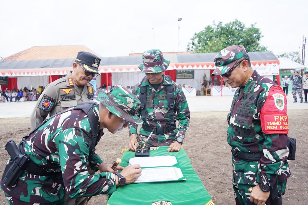 “Melalui TMMD, TNI hadir di tengah masyarakat bukan hanya untuk membangun infrastruktur, tetapi juga membangun semangat kebersamaan, gotong royong, serta memperkuat ketahanan nasional dari tingkat desa,” ujar Danrem membacakan amanat Pangdam.