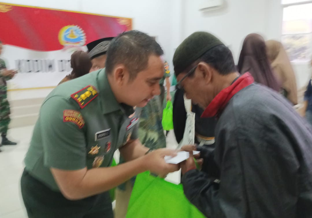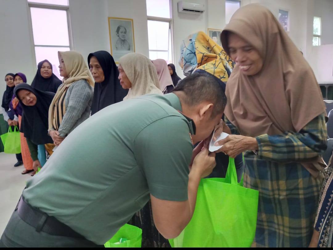 Dalam suasana penuh keakraban, warga menerima bantuan berupa paket sembako dan kebutuhan pokok lainnya yang diberikan langsung oleh Dandim dan jajaran anggota Kodim.