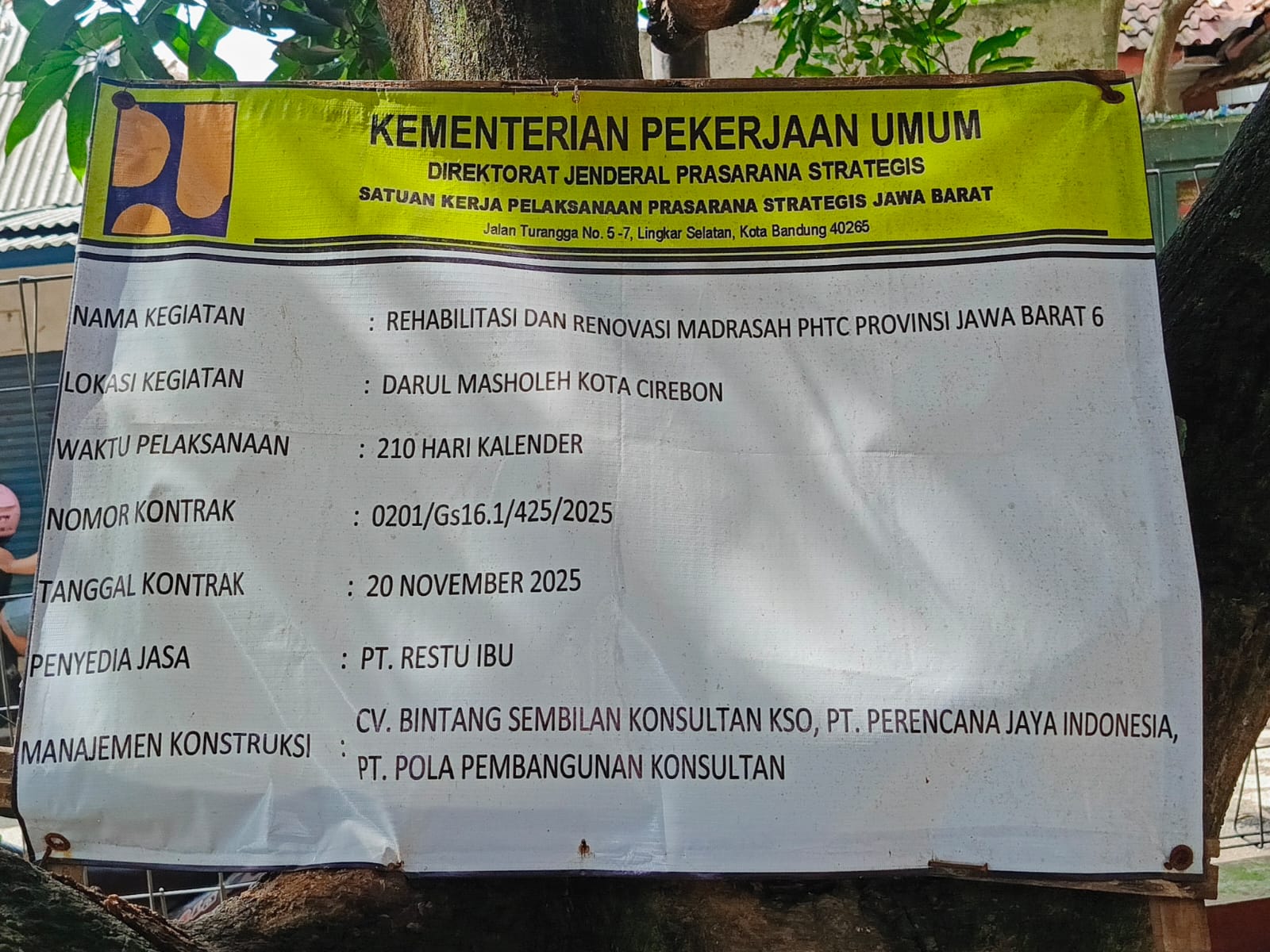Berdasarkan papan informasi di lokasi, proyek ini bernama “Rehabilitasi dan Renovasi Madrasah PHTC Provinsi Jawa Barat 6” yang berlokasi di Madrasah Darul Masholeh, Kota Cirebon. Waktu pelaksanaannya ditetapkan selama 210 hari kalender, dengan Nomor Kontrak 0201/Gs16.1/425/2025 tertanggal 20 November 2025.