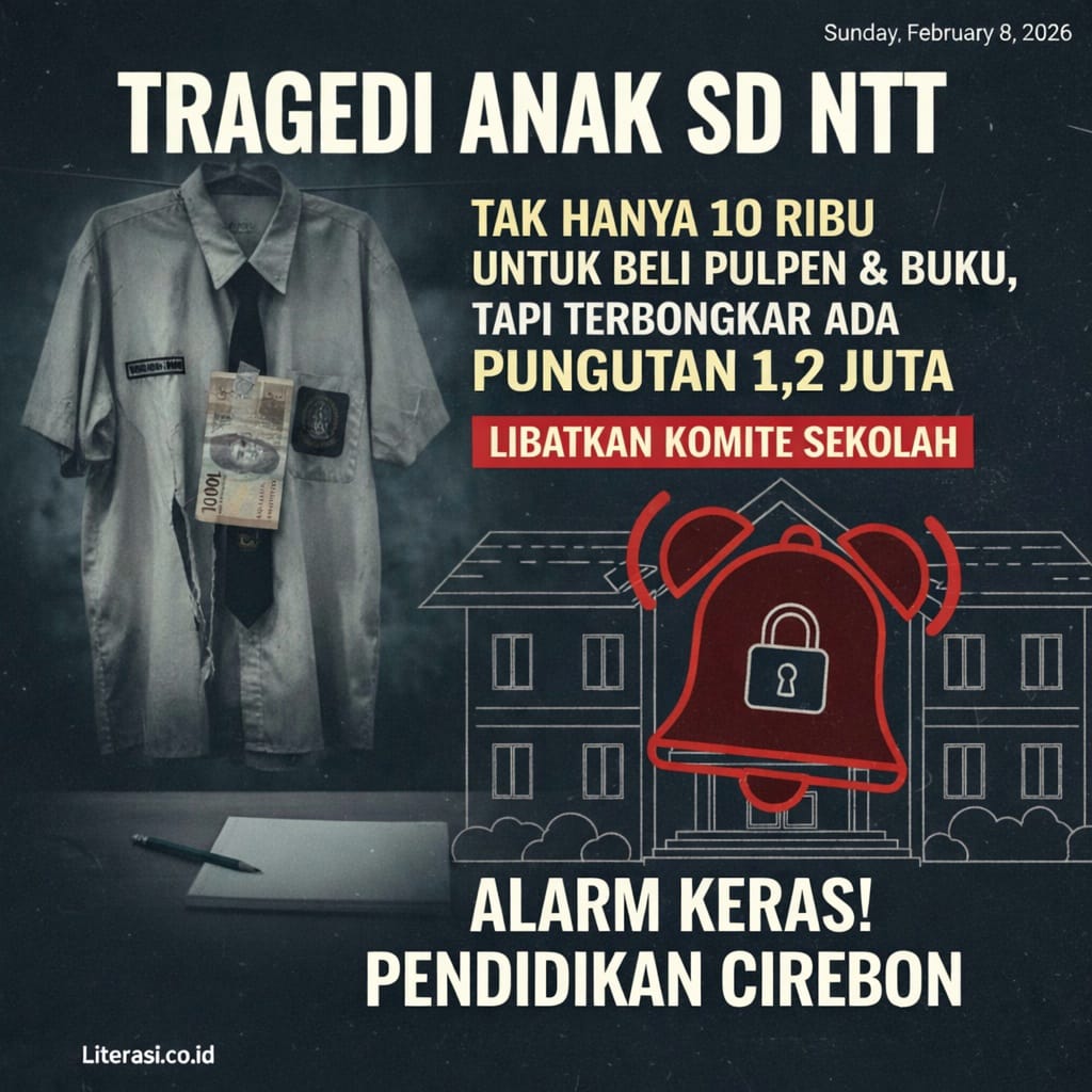 Literasi.co.id, CIREBON 8 ferbruari – Tragedi pilu yang menimpa seorang anak sekolah dasar di Nusa Tenggara Timur (NTT) tidak bisa lagi dipersempit sebagai persoalan sepele akibat tidak diberi uang Rp10 ribu untuk membeli pulpen dan buku. Fakta yang terungkap di lapangan justru jauh lebih serius dan mencoreng dunia pendidikan nasional: adanya kebijakan pungutan sekolah hingga Rp1,2 juta per siswa, yang ditetapkan melalui keputusan internal sekolah bersama komite sekolah.