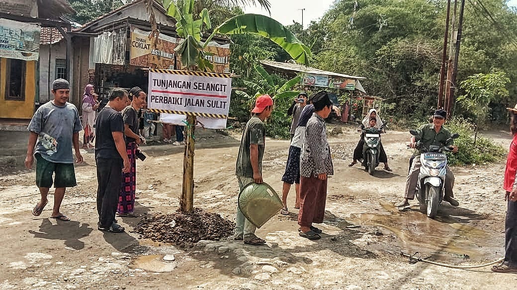 Literasi.co.id, Cirebon, 3 Oktober 2025 – Rasa kesal warga Jalan Kalilunyu dan Sumur Wuni, Kelurahan Argasunya, Kota Cirebon, akhirnya memuncak. Pada Jumat siang (3/10), mereka turun ke jalan melakukan aksi demonstrasi di titik jalan yang rusak parah. Dengan kompak, warga membentangkan spanduk bertuliskan “TUNJANGAN SELANGIT, PERBAIKI JALAN SULIT” sambil menanam pohon pisang di tengah jalan sebagai simbol protes keras.
